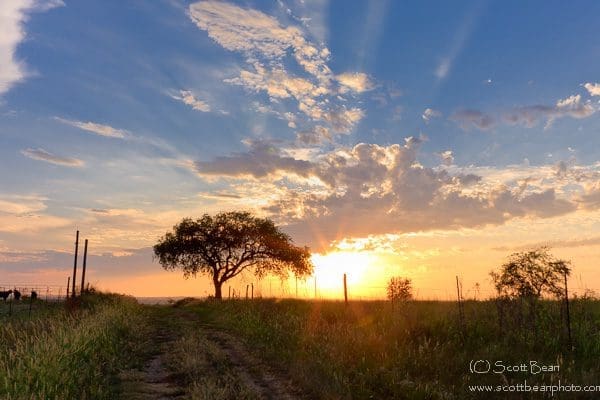 After shooting around the first tree we stopped at, I moved on down the road to this next tree. By this time, the sun had broken free of the clouds and was very bright. No chance now to record it as a ‘star burst’, but the color of the sunset was intensifying. I zoomed in tight on this tree which I thought looked good beside the setting sun. I’d like to say that I really thought about the composition and carefully arranged all the elements in it. I’m an instinctual shooter though and I react more to scenes than I think about them. Something I’m working on, but that is for another blog post. (tech stuff: ISO 100, f22, 1/30, 45mm)