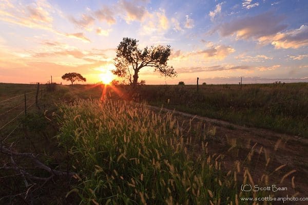After working both these two trees, I decided to switch to my ultra wide angle lens (my 10-22mm) and try some wider shots. With wide angle lenses, the foreground becomes very important. I liked the way the setting sun was illuminating the grasses in the area so I got down low and right above the grass with my lens at it’s widest setting for the above shot. Again, I used the smallest setting I could on my lens (f22) to get the star burst effect on the sun just as it was going below the horizon. As with most of the photographs I took on this evening, I bracketed my exposures so I could put together HDR’s when I got back home. However, there was just enough of a breeze that I couldn’t do that. You can see in this shot some motion blur in the grass due to the breeze. To bring out the foreground detail in this shot, I processed the raw file 4 times, creating a ‘pseudo HDR’. In essence I darkened the shot by 1 stop, brightened it by 1 and 2 stops and combined those 3 ‘brackets’ with the original in Photomatix. Since I was using the same photo in each ‘bracket’, I didn’t have to worry about any alignment issues between shots. I could have also used a split neutral density filter to achieve a similar affect. I think this was my favorite shot of the evening. (tech stuff: ISO 100, f22, 1/2, 10mm).